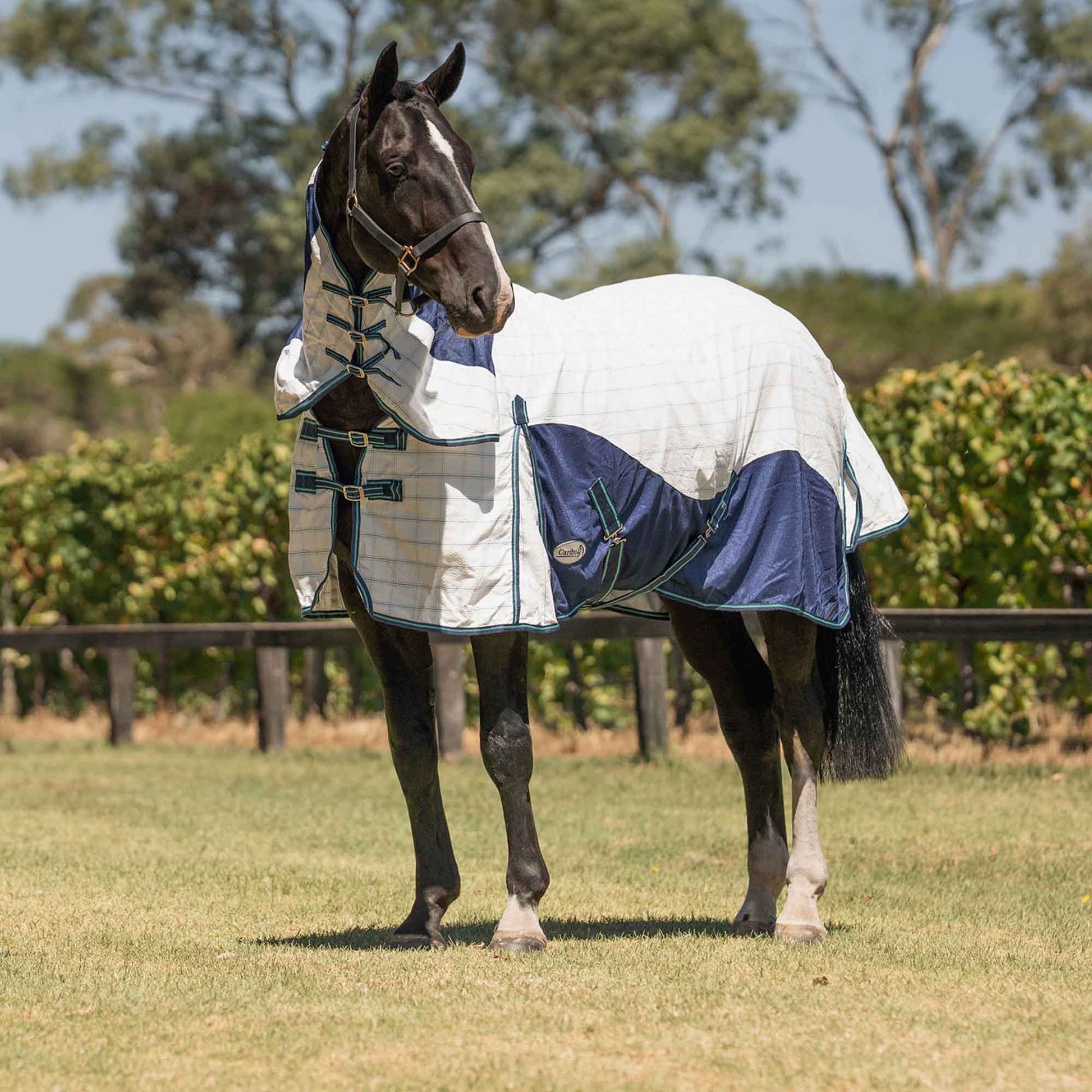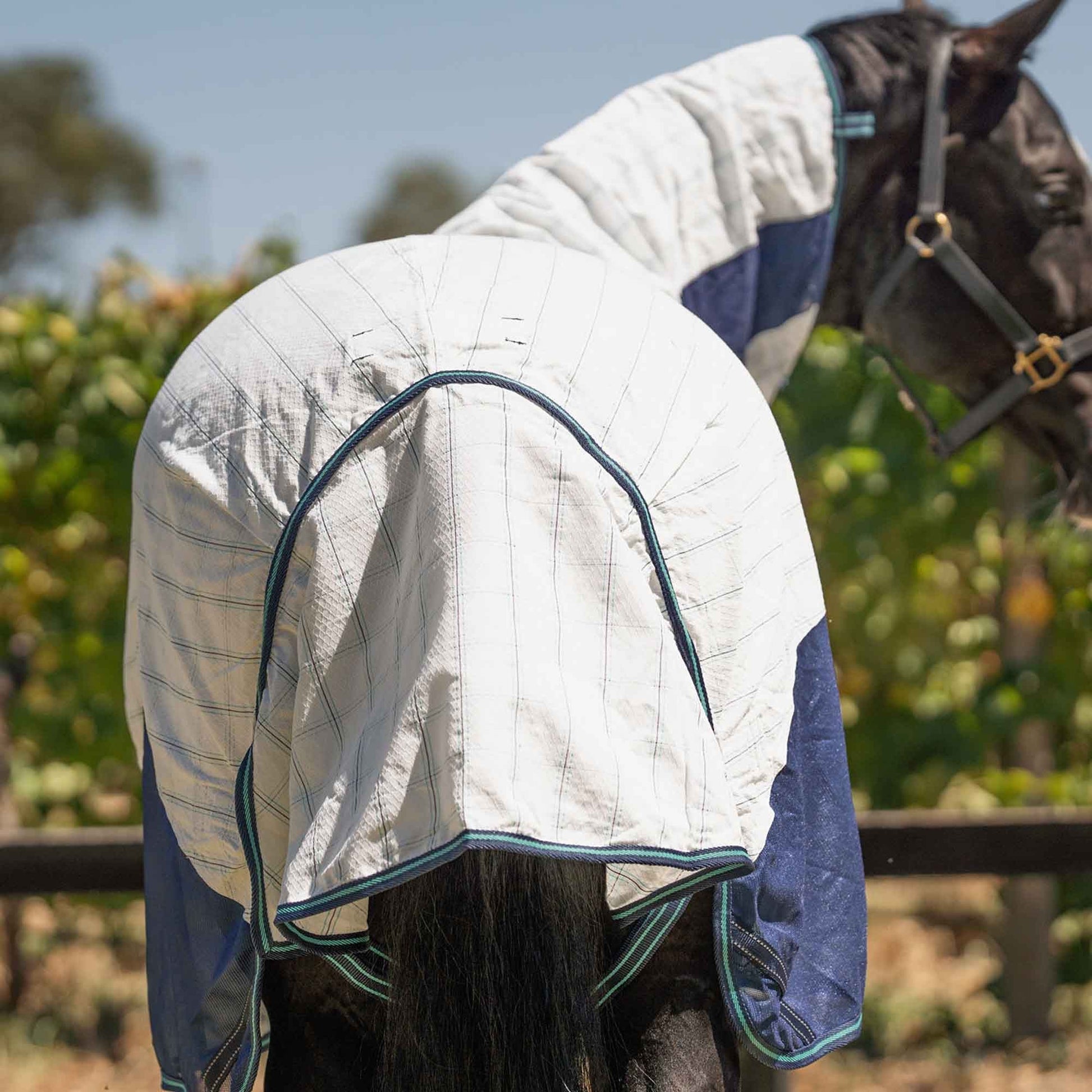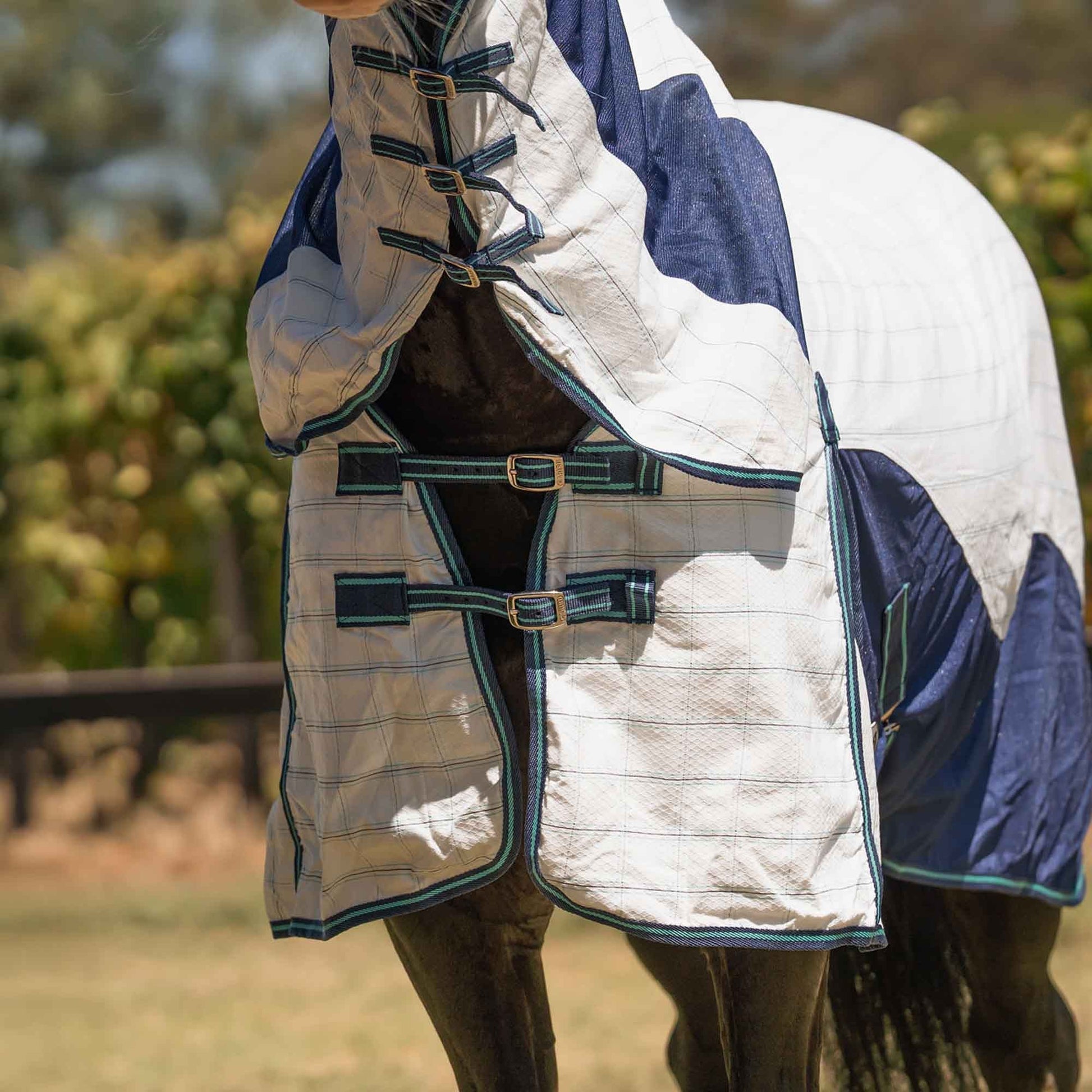 The Caribu Atla Hybrid Combo combines the best features of a polyester rug and mesh all in one rug. Made with our diamond weave Ripstop fabrication for strength and durability, it also features mesh panels in the neck and skirts to allow for extra airflow, keeping your horse cool and protected on warm days.